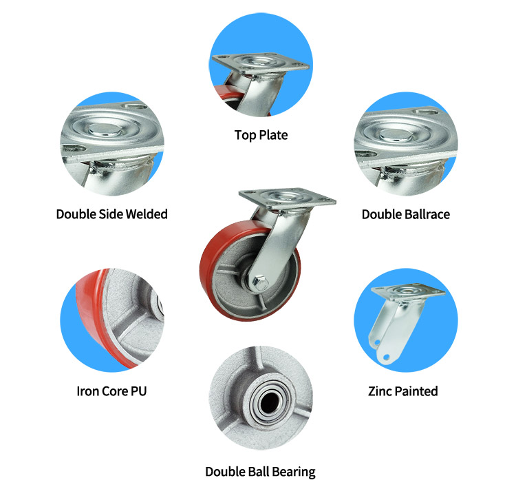 Đây là bánh xe PU lõi gang chịu lực nặng, tấm xoay, bánh xe 4 inch, 5 inch, 6 inch và 8 inch để lựa chọn, chúng là một trong những loại bánh xe chắc chắn, bền và không gây tiếng ồn trên thị trường. Chúng có hai ổ trục bi giúp chúng di chuyển trơn tru.