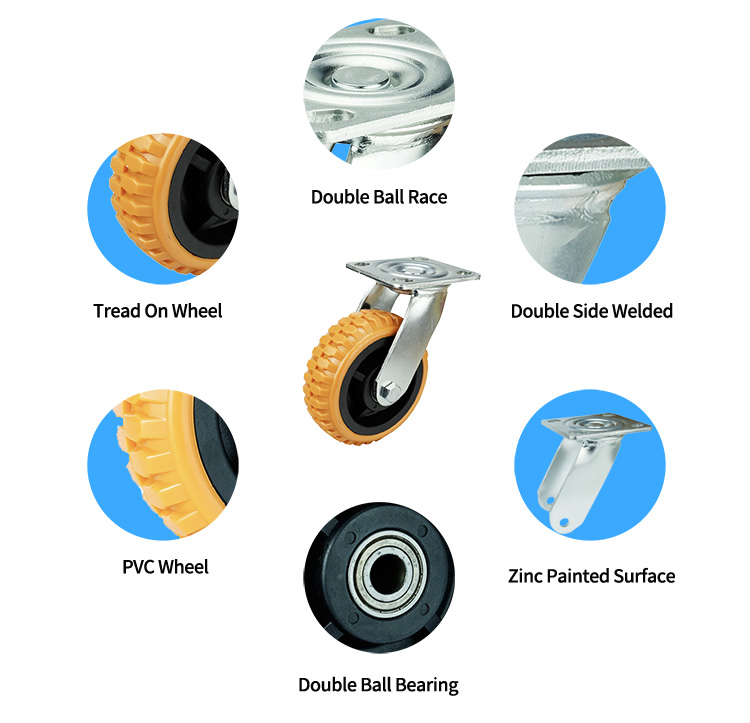 Bánh xe PU/PVC lõi PP chịu lực loại tấm xoay, bánh xe 4 inch, 5 inch, 6 inch và 8 inch để lựa chọn, chúng là một trong những loại bánh xe chắc chắn, bền và không gây tiếng ồn trên thị trường.